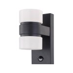 Iluminación LED geométrica bidireccional de 360 lúmenes con luz cálida 3000K, estructura negra en acero galvanizado y protección IP55 para fachadas y terrazas exteriores.